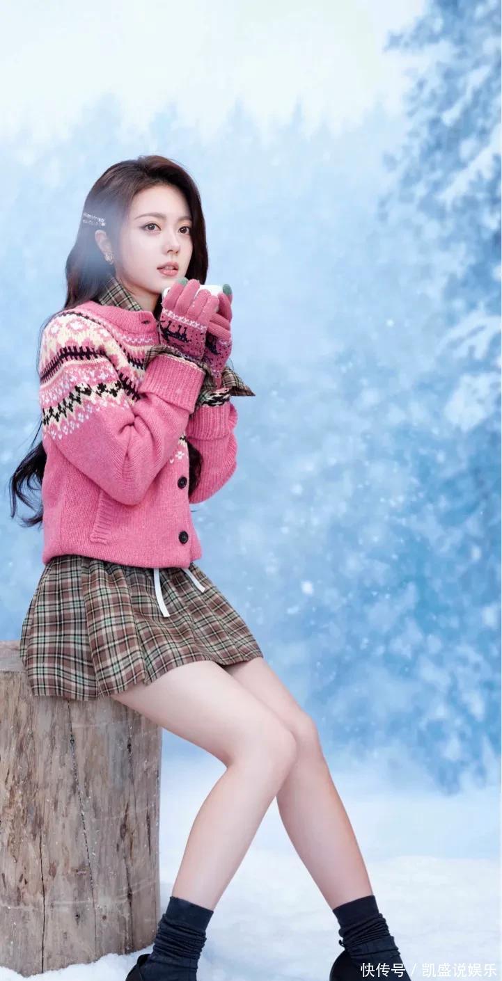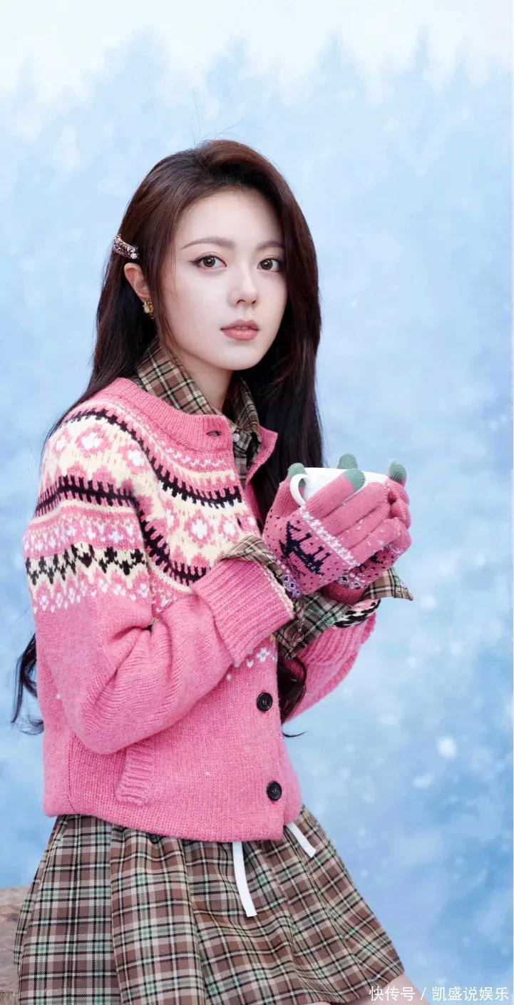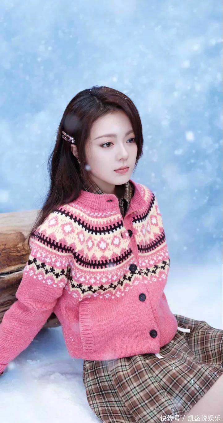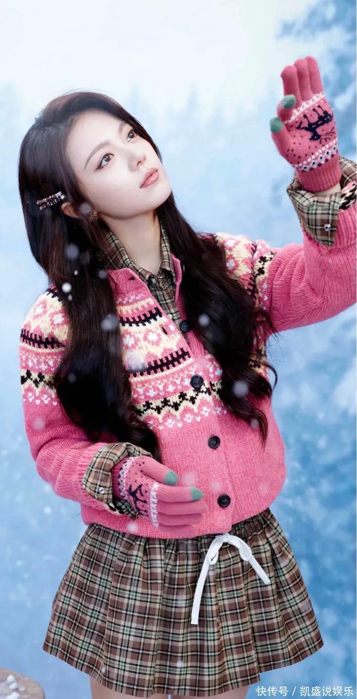 冰天雪地里,她裹着一身粉粉糯糯的毛衣开衫,配上格纹小短裙,往那儿一站,整个人就像雪地里突然冒出来的一颗草莓糖!那个粉色,不是那种扎眼的粉,是软乎乎、暖洋洋的,跟后面白茫茫的雪一衬,绝了!感觉冷风都变温柔了。